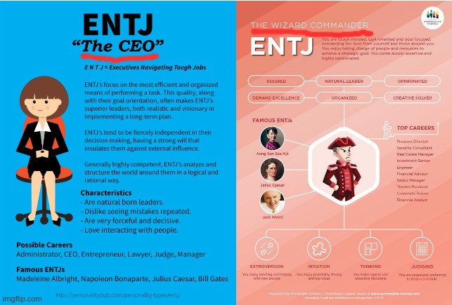 Take, for example, the internet meme concept of an ENFP. Are you seeing a sparkly unicorn or a fairy? Perhaps you’re imagining someone with ADHD? This is the internet meme. It's really only useful for shallow humor at the expense of another person, even if there's some relatable shred of truth in it. An ESFP might be imagined as a empty-headed, self-indulgent party animal (possibly also with ADHD), while an ENTJ might be envisioned as a brusque, commanding, overbearing CEO of a company (not sure what the mental disorder associated with ENTJs is).