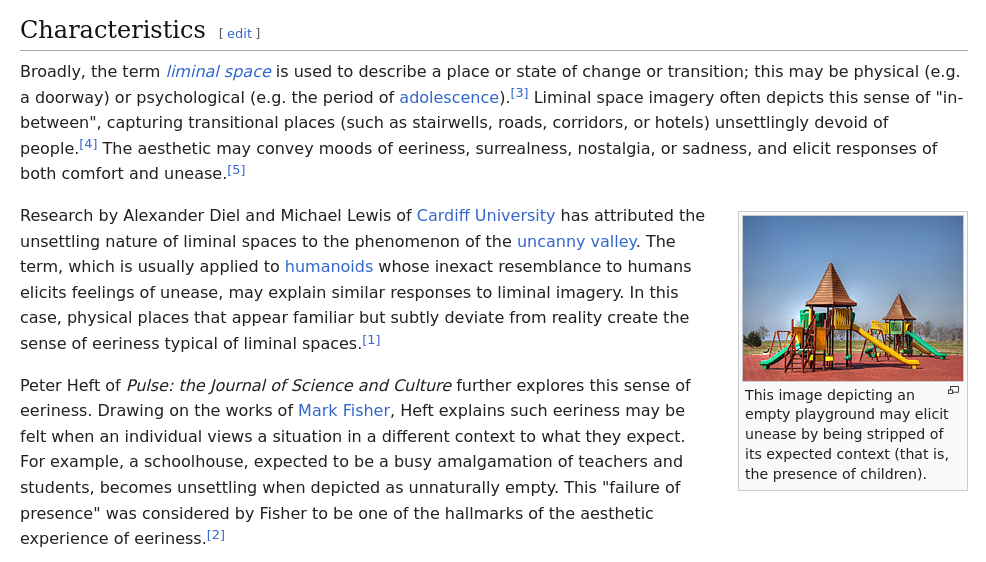 Wikipedia has some interesting stuff on liminal spaces if you're bored and looking for something random to study: