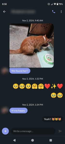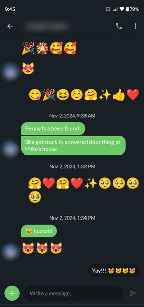 That night was still difficult, I missed having Penny there with me, but I was able to sleep much better and felt this reassurance that we were going to find Penny the next day. I was able to come in for work the next morning, and about an hour before my shift ended I got texts from both my parents with a picture of Penny safely back home.
