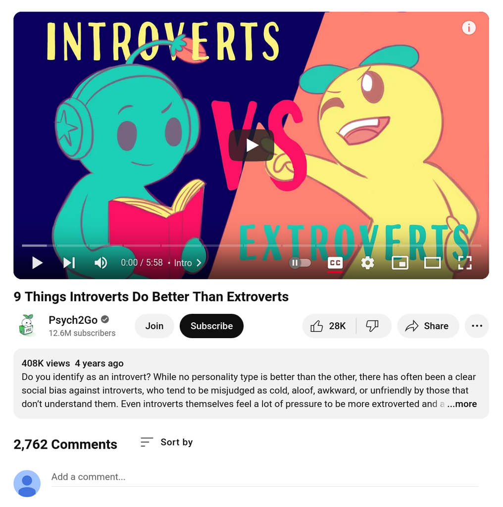 I've been meaning to write commentary on this so many times. I would hop on YouTube and search for something about extroverts (trying to learn more about how to be more like, well, me), and then end up being bombarded with video titles like, "9 Things Introverts Do Better Than Extroverts" and "10 Extrovert Behaviors that Introverts Hate," along with, weirdly, another X-Things-X-Do-Better-Than-X video titled "10 Things Introverts Do Better Than Extroverts.”